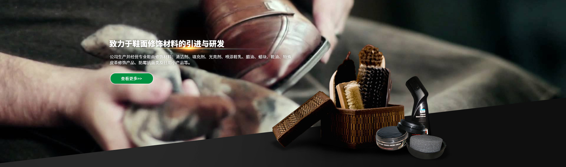 公司生產(chǎn)并經(jīng)營(yíng)專業(yè)鞋面修飾材料:清潔劑、填充劑、光亮劑、噴涂鞋乳、臘油、蠟塊、鞋油、特殊皮革修飾產(chǎn)品、防霉抗菌類及日用小產(chǎn)品等。